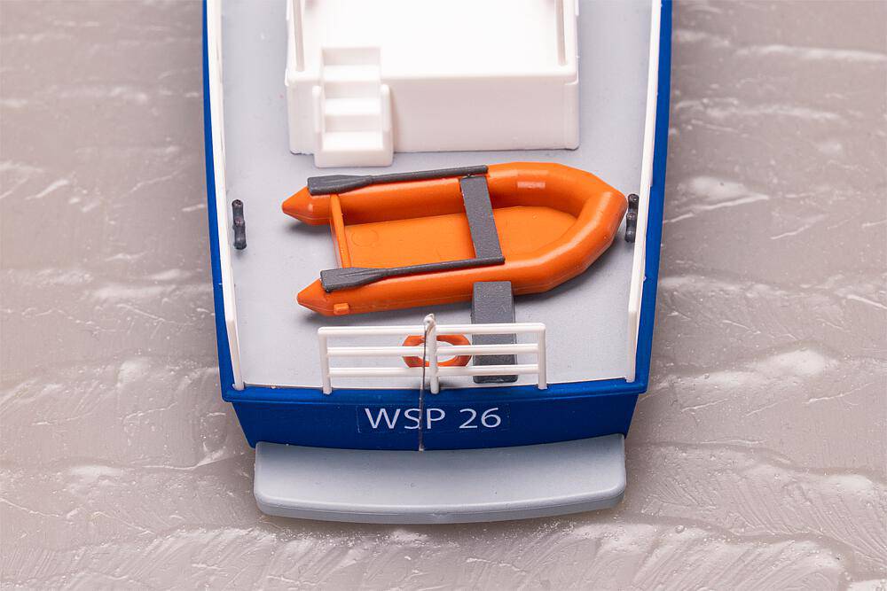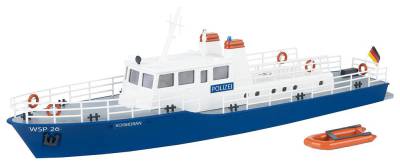 Le modèle réduit du petit bateau de police bleu (modèle de ligne de flottaison - non flottant) est principalement conçu pour être utilisé sur les eaux intérieures et les rivières. Avec sa coque pointue et sa timonerie peinte en blanc - clairement identifiée par l'inscription Police - il se dirige vers sa prochaine mission. La généreuse surface de chargement offre de la place pour différents équipements et un canot de sauvetage rouge assorti est inclus.