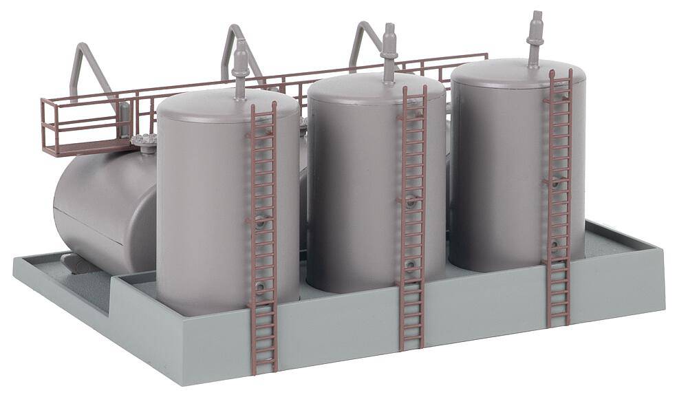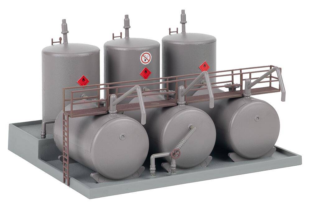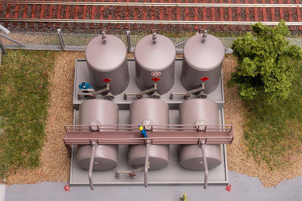 Dépôt de carburant en surface avec trois réservoirs de carburant couchés et trois réservoirs de carburant debout. De conception robuste et réalisé dans les moindres détails, il convient pour compléter de manière réaliste des installations industrielles ou portuaires dans des mondes miniatures.