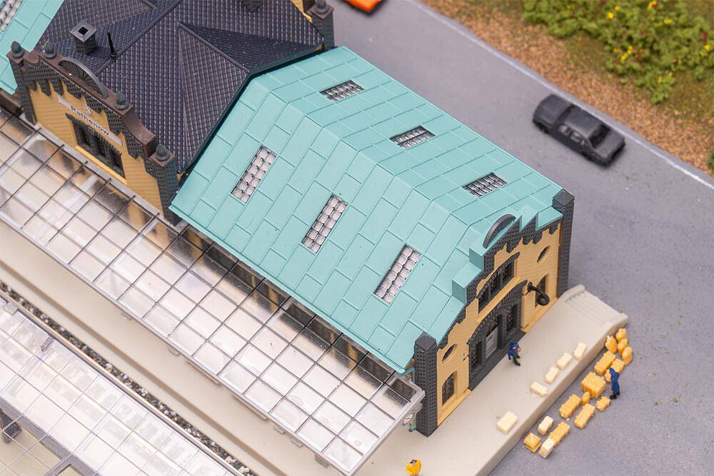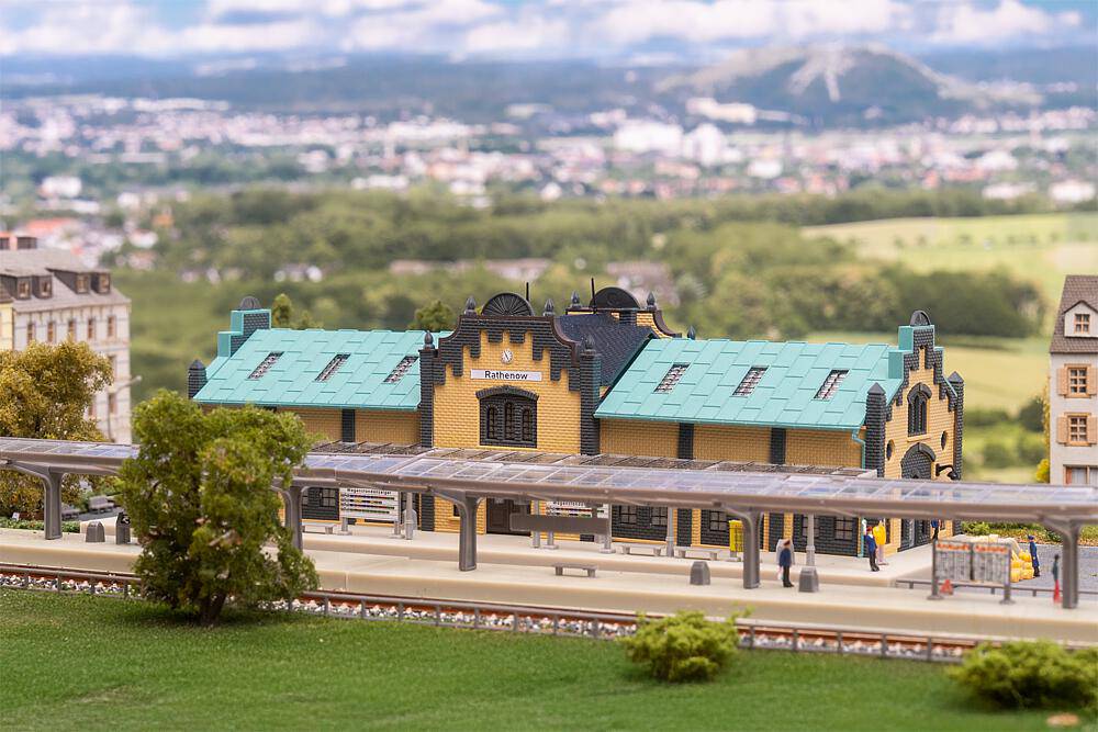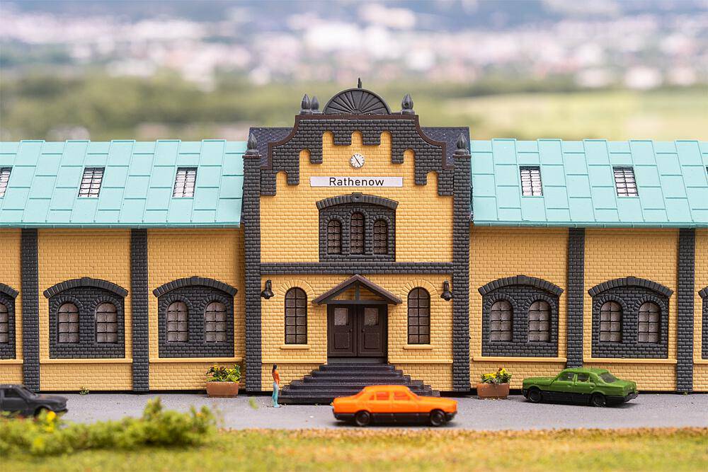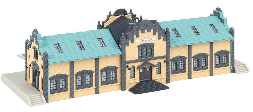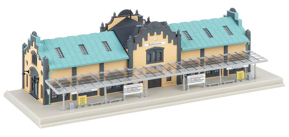 Ce modèle capte le charme du début du siècle: un toit turquoise clair, une façade en pierre jaune claire et un toit vitré sur le quai du côté de la voie donnent du caractère à la gare. La construction claire en briques et les détails soignés en font un point central évocateur de chaque réseau. Le modèle est autonome sur le plan architectural et n'a aucun rapport avec la gare originale de Rathenow (Brandebourg).