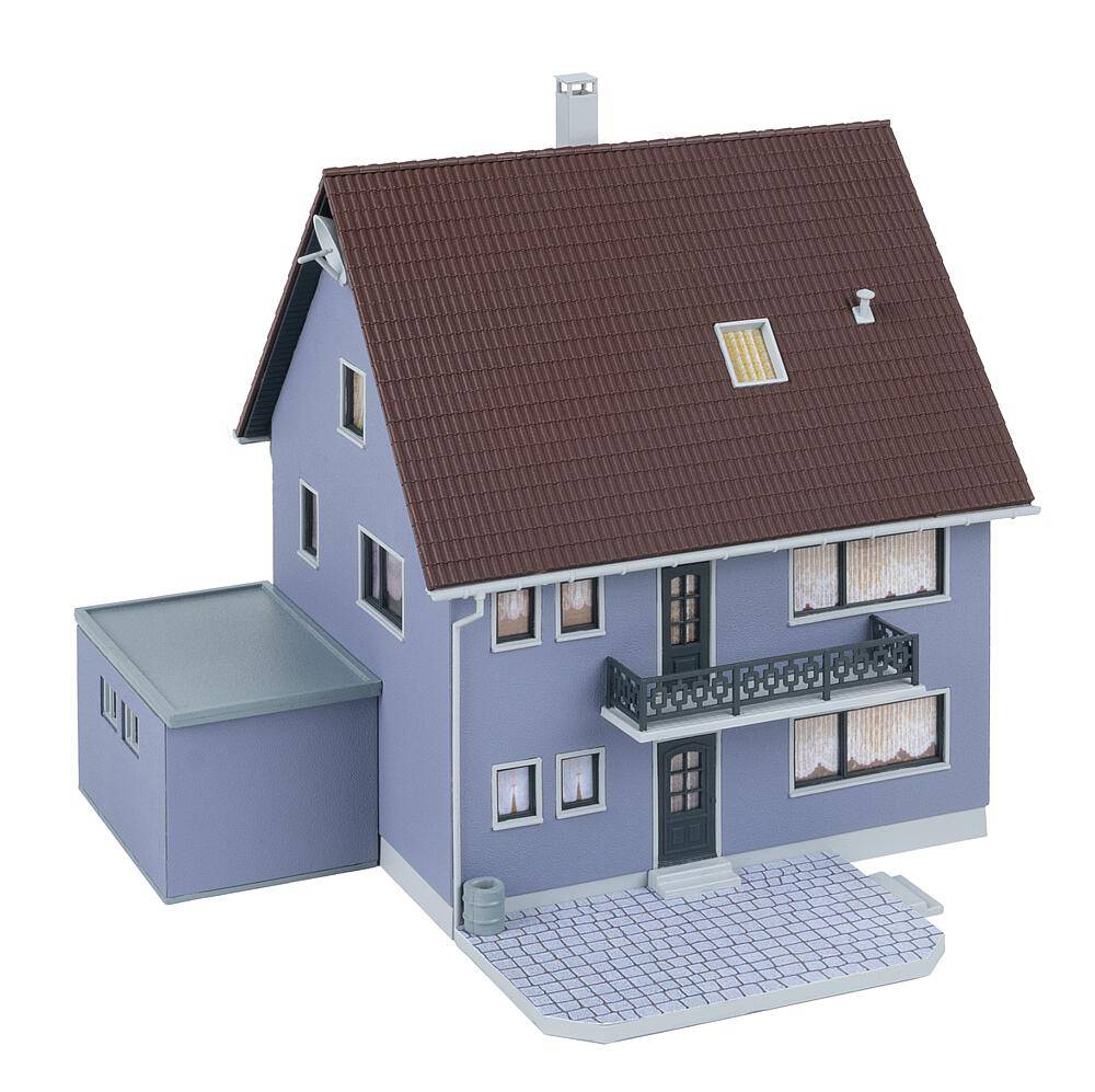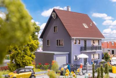 Cette charmante maison bifamiliale séduit par sa peinture de couleur violette et son toit à deux pentes classique en tuiles brunes. Une annexe de garage latérale, une terrasse généreuse à l'arrière ainsi qu'un balcon complètent harmonieusement le modèle - idéal pour créer un petit lotissement de banlieue.