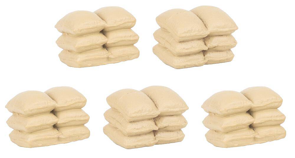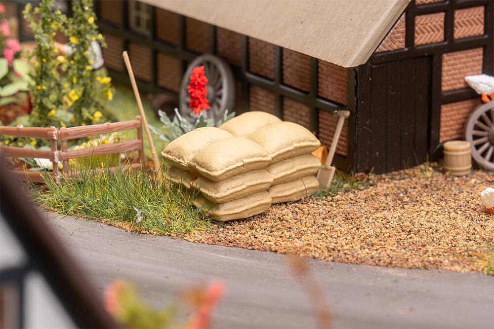 L'ordre est nécessaire! Cinq piles de sacs en tissu clair, modélisées de manière réaliste, conviennent parfaitement à l'aménagement d'entrepôts, de halls de marchandises ou de scènes rurales. Qu'il s'agisse de céréales, de farine ou d'autres marchandises en vrac, ces petits détails animent le monde des modèles réduits.