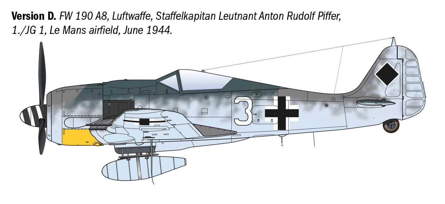Produit à plus de 20 000 exemplaires à partir de 1941, il fut, avec le Messerschmitt Bf 109, le chasseur le plus célèbre de la Luftwaffe. Le Focke-Wulf Fw 190 A-8 était équipé d’un moteur radial BMW 801 D-2 à double étoile de 14 cylindres développant 1 700 ch, ce qui lui permettait d’atteindre une vitesse maximale de 653 km/h. Il était lourdement armé de deux mitrailleuses MG 131 et de quatre canons MG 151 de 20 mm. Au cours des premiers mois de 1944, la version A-8 entra en production, caractérisée par un système d’injection capable d’augmenter, pendant de courtes périodes, la puissance du moteur à plus de 1 900 ch. Les meilleurs pilotes de la Luftwaffe ont piloté ce célèbre chasseur durant la Seconde Guerre mondiale.