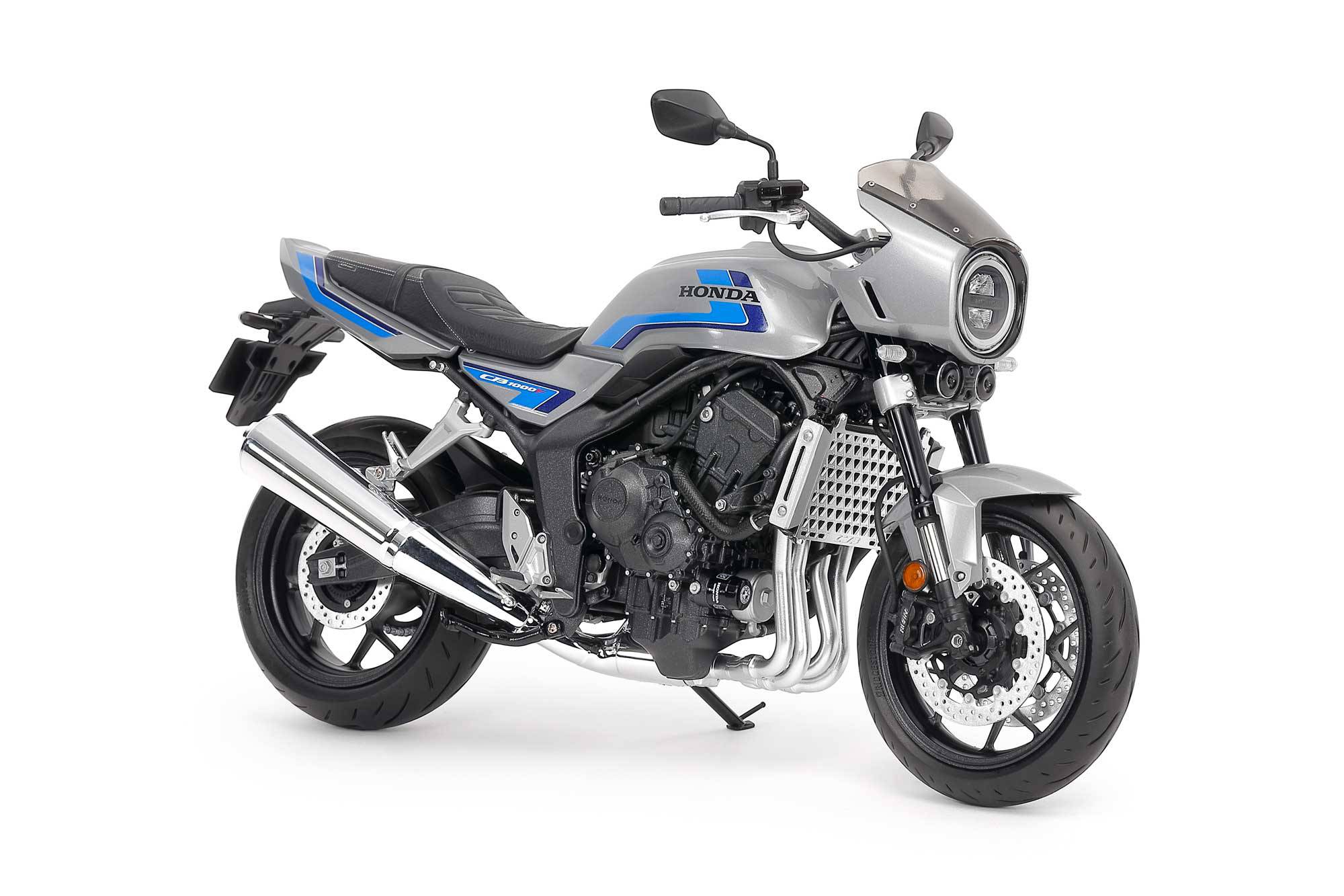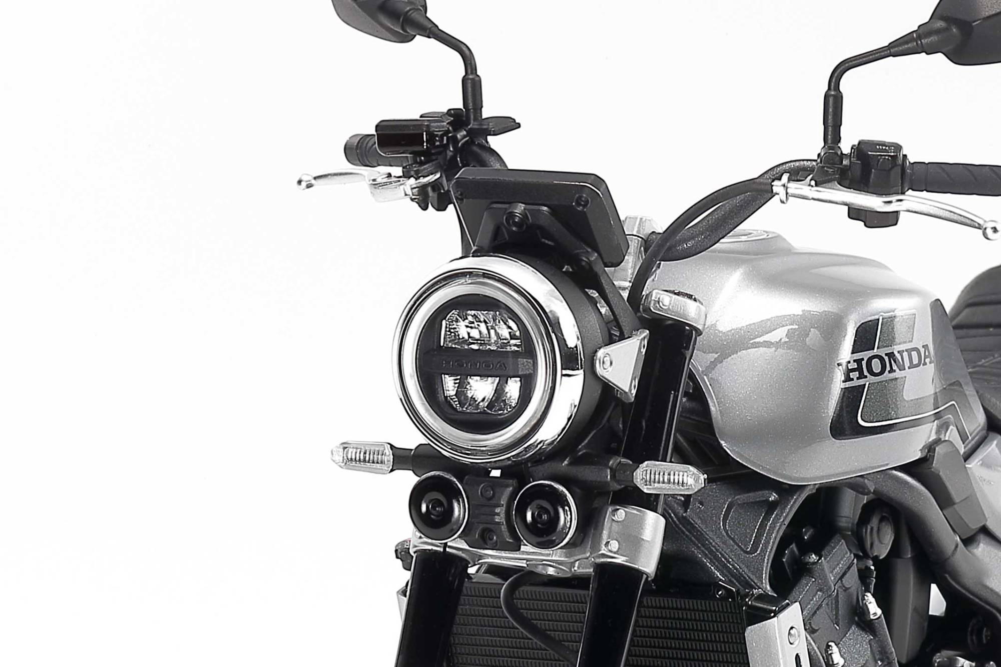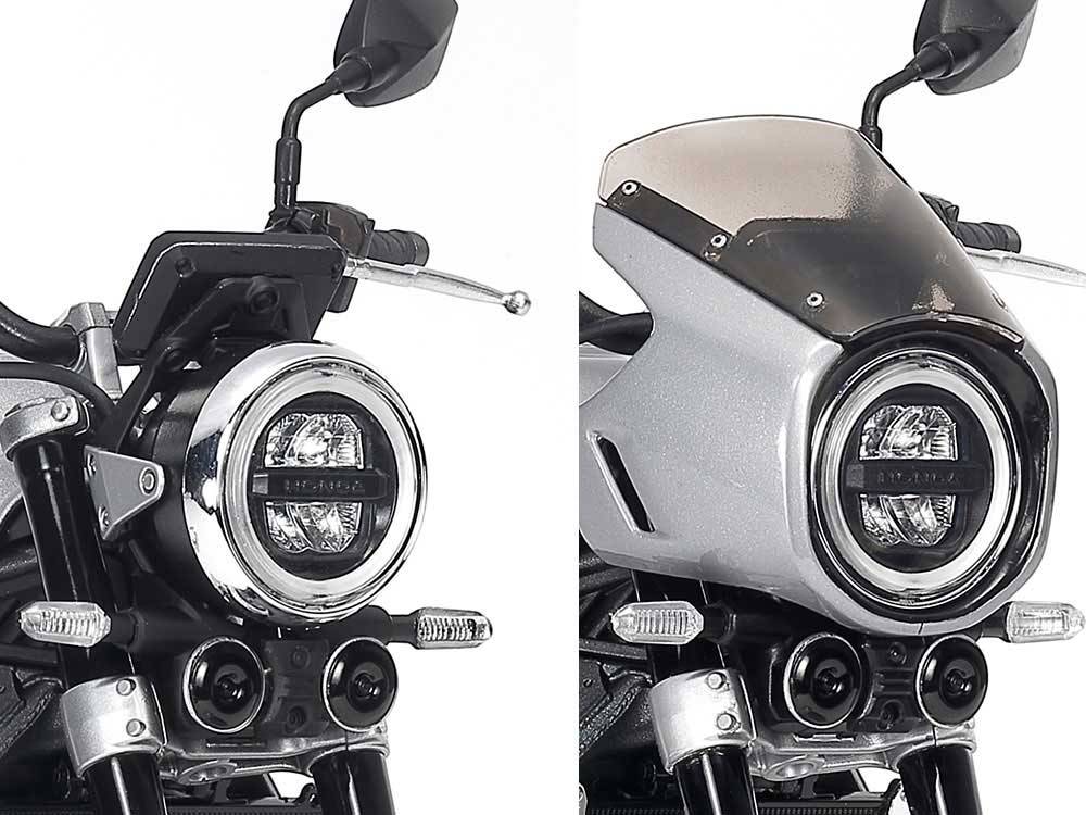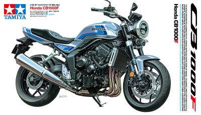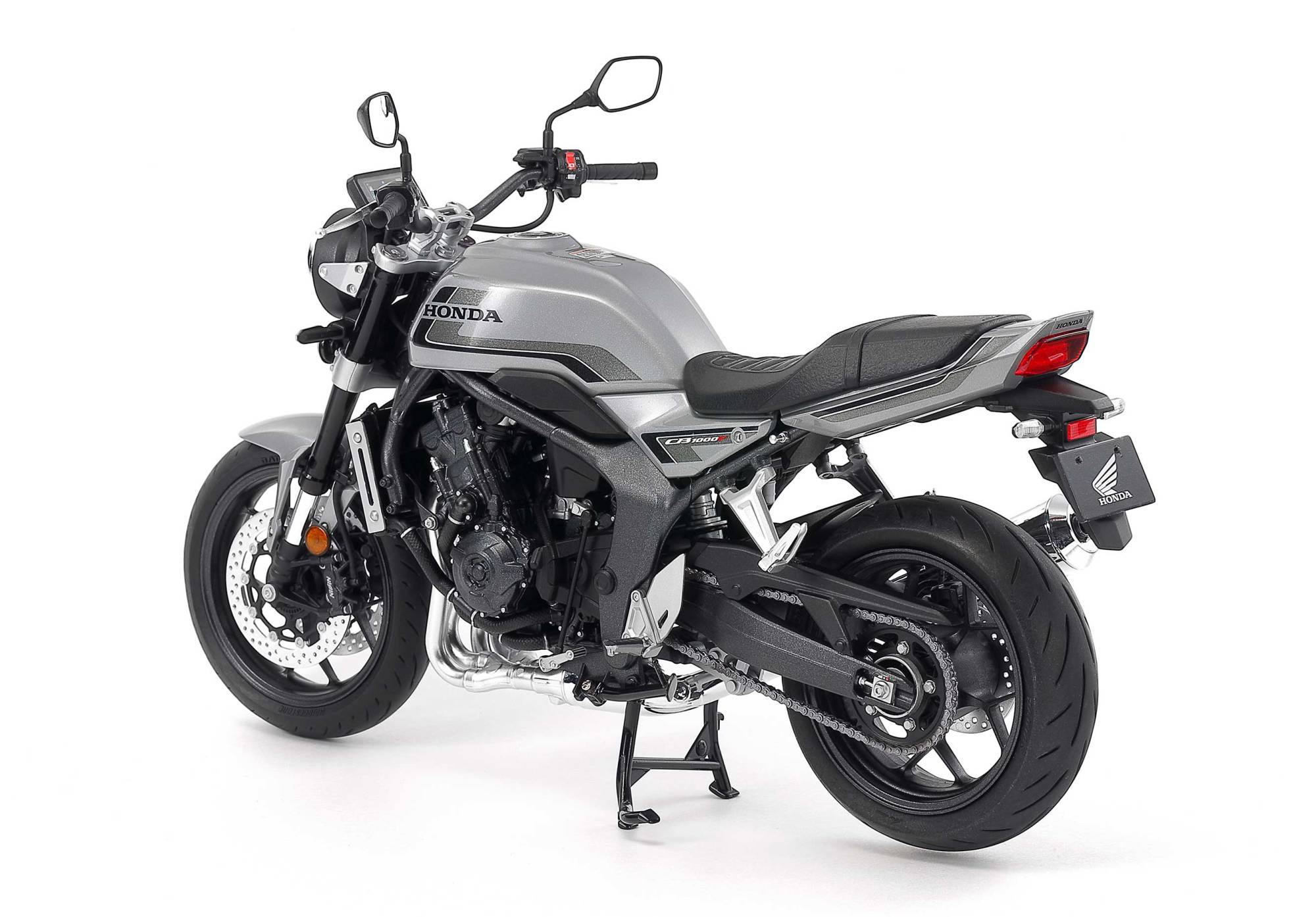 Le concept CB1000F “Best Balance Roadster” devait répondre à divers contextes, de l’utilisation quotidienne aux longs voyages. Il reprend et actualise le style emblématique "Flowing Line" popularisé sur les CB750F/900F qui l’ont précédé, avec une forme s’étirant harmonieusement du réservoir jusqu’à l’arrière, via des carénages latéraux arrière donnant à la moto sa silhouette musclée et élancée. Le phare rond attire le regard avec un design à la fois moderne et traditionnel, entouré d’un feu de position à LED avec cerclage chromé et partie centrale gravée du logo HONDA. A l’arrière, la surface de la selle s’inspire de la CB750F, et le regard est attiré par des éléments de design tels que le feu arrière angulaire et le silencieux dominant le côté droit de la moto. Pour certains, l’abréviation CB signifie "C" pour "motorcycle" et "B" pour "clubman", mais pour cette nouvelle version, "C" pour "creative" et "B" pour "benchmark" (référence) s’applique aussi bien. Tamiya nous propose dès maintenant une réplique fidèle et détaillée de cette remarquable et iconique machine.