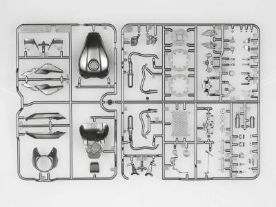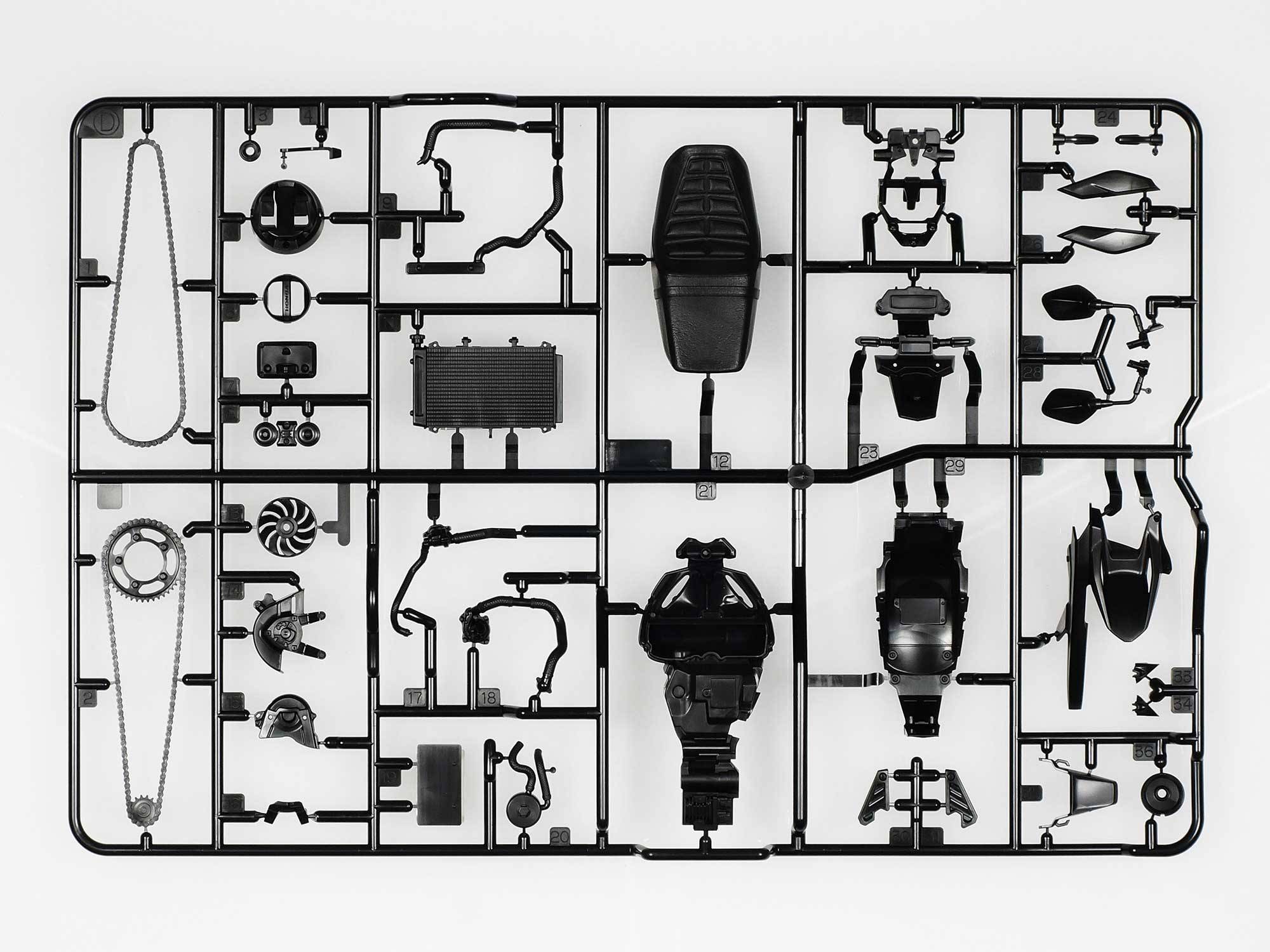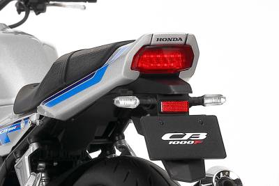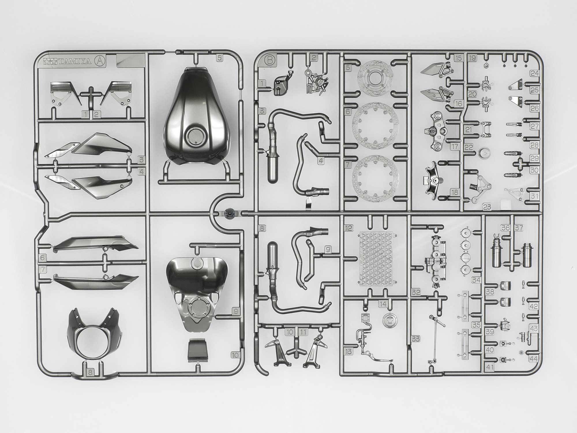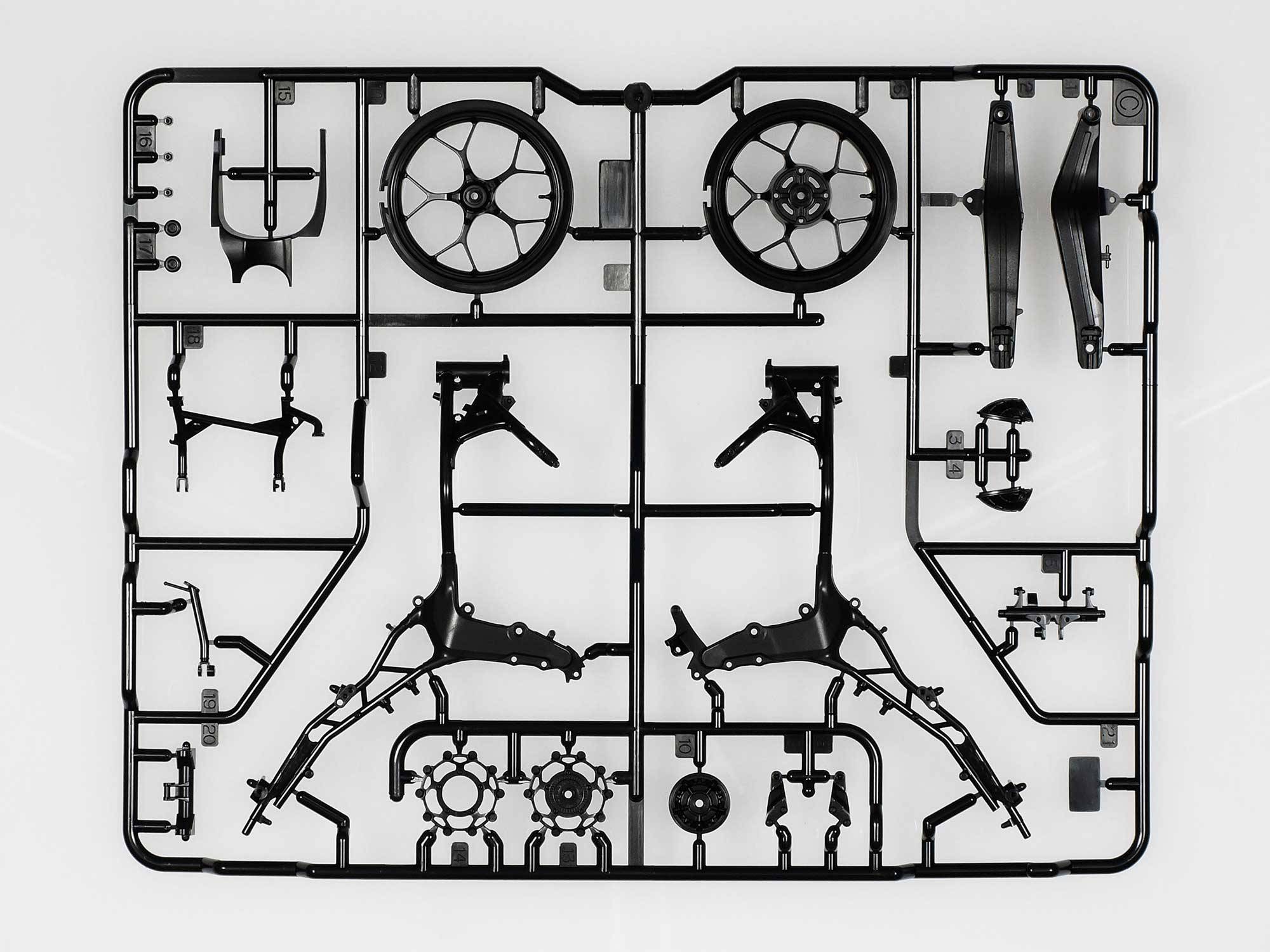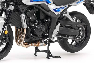Le concept CB1000F “Best Balance Roadster” devait répondre à divers contextes, de l’utilisation quotidienne aux longs voyages. Il reprend et actualise le style emblématique "Flowing Line" popularisé sur les CB750F/900F qui l’ont précédé, avec une forme s’étirant harmonieusement du réservoir jusqu’à l’arrière, via des carénages latéraux arrière donnant à la moto sa silhouette musclée et élancée. Le phare rond attire le regard avec un design à la fois moderne et traditionnel, entouré d’un feu de position à LED avec cerclage chromé et partie centrale gravée du logo HONDA. A l’arrière, la surface de la selle s’inspire de la CB750F, et le regard est attiré par des éléments de design tels que le feu arrière angulaire et le silencieux dominant le côté droit de la moto. Pour certains, l’abréviation CB signifie "C" pour "motorcycle" et "B" pour "clubman", mais pour cette nouvelle version, "C" pour "creative" et "B" pour "benchmark" (référence) s’applique aussi bien. Tamiya nous propose dès maintenant une réplique fidèle et détaillée de cette remarquable et iconique machine.